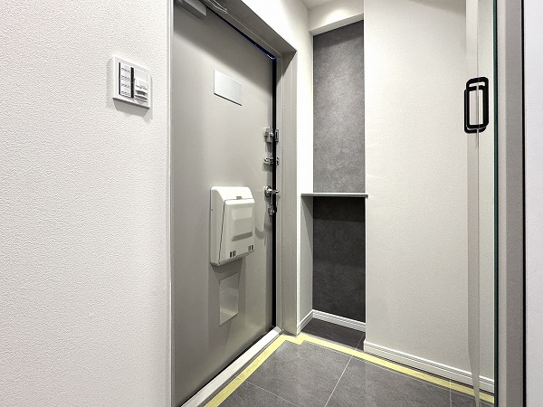 アプローチは庇が広く、雨具や日傘をゆっくりと準備できます。扉の前に置かれた南国風の植栽がとても綺麗に整えられており、管理体制の良さを感じずにはいられません。