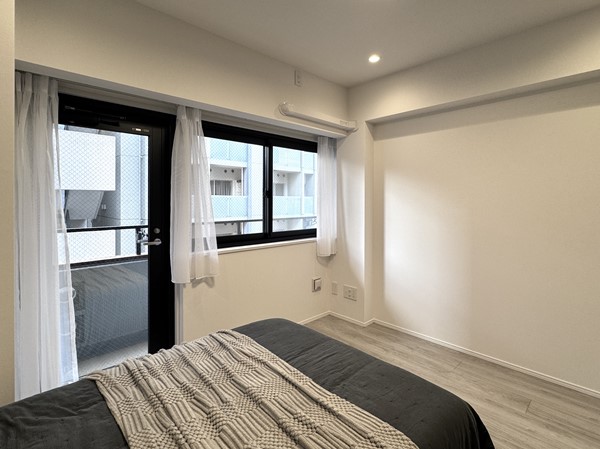 8階に位置する1LDKのお部屋は、新規リノベーションによりスタイリッシュかつスマートな大人の住処に生まれ変わりました。窓枠のクールなブラックと澄んだホワイトの壁のコントラストに、ベージュ調のアクセントクロスが柔らかな魅力をプラス。