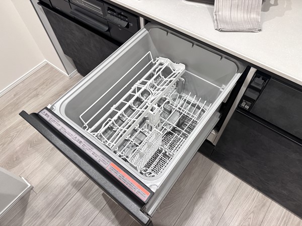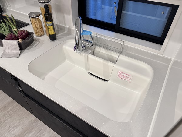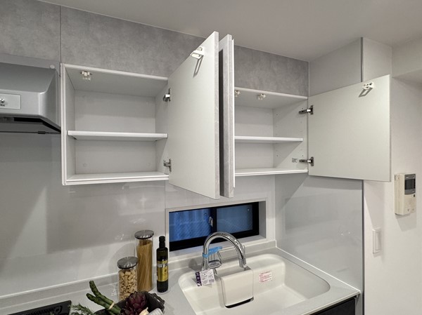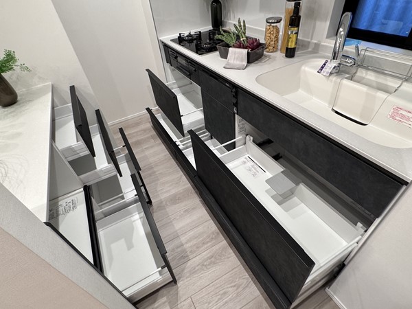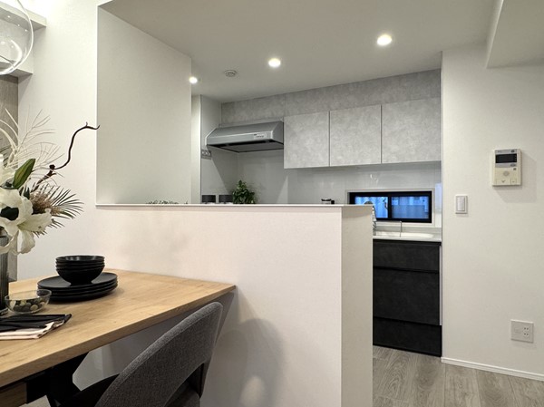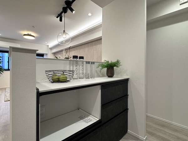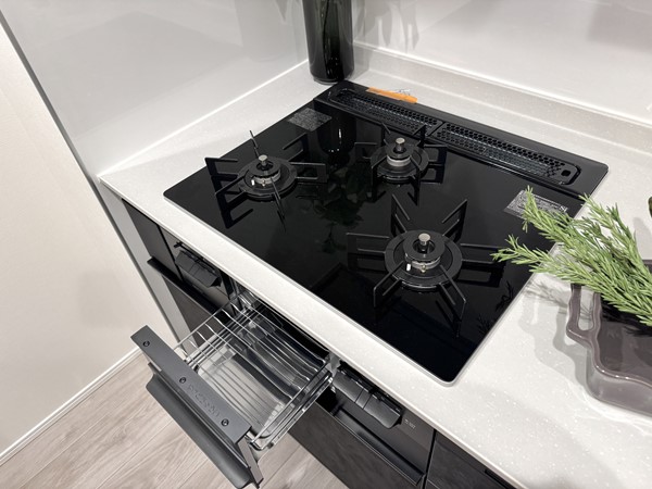 ブラックのスタイリッシュな壁付きキッチンはお料理も楽しめる3口コンロを搭載。背面のカップボードの向こうにはメインルームが広がり、圧迫感をもたらすことなく、空間をスマートに区切る役割を果たしてくれます。食器の収納のほか、ちょっとしたドリンクを置いておくのにも役立つ存在です。