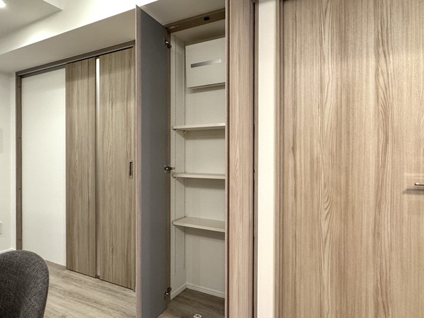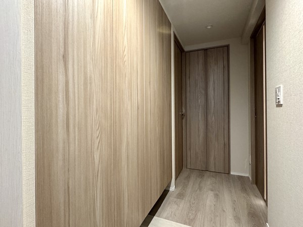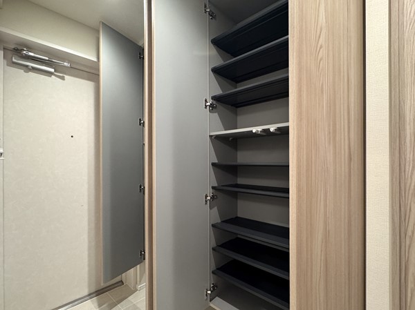 シューズインクローゼットにはプッシュオープン式の扉を採用。無垢の木を思わせる滑らかな手触りが、エントランススペースにスタイリッシュな印象をもたらします。シューズをたくさんお持ちの方でも安心の大容量設計がありがたいですね。ペットのお散歩グッズを収納するなんていう使い方もありかもしれません。