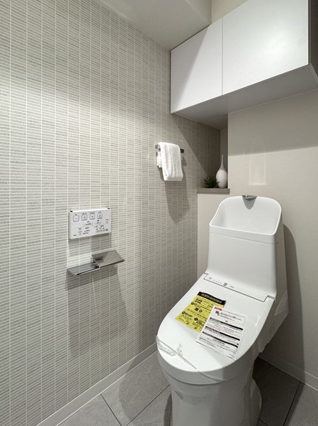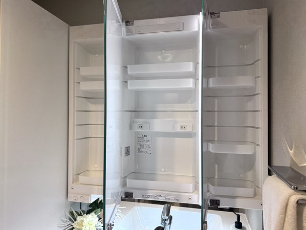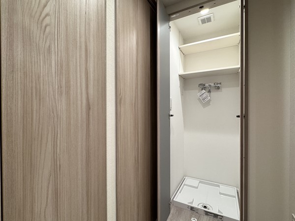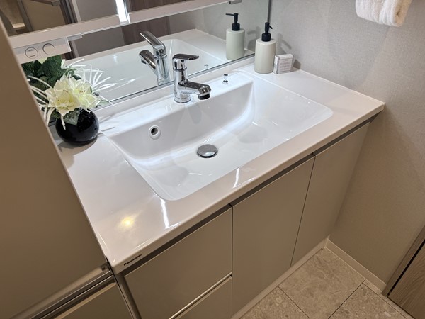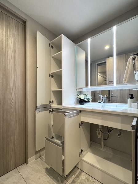 清潔感第一のウォッシュルームには、大容量の収納を備えた洗面化粧台を設置。スキンケア用品やお掃除グッズをしまえば、見せない収納が叶います。ベージュ系統でまとめられた空間は、毎日使っても飽きが来ず魅力的です。