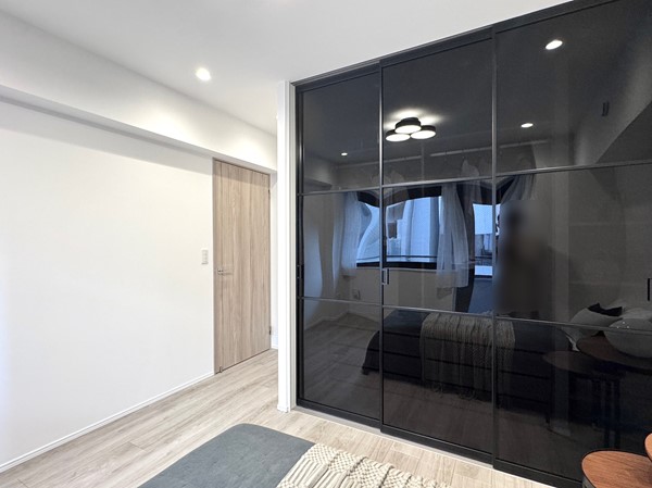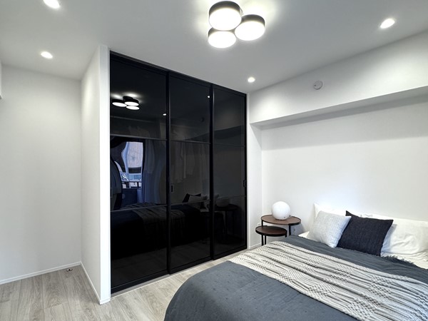 ベッドルーム内の収納は余裕を持たせた造り。ハンガーポールは形を崩したくないドレスやシャツの収納にぴったりです。ブラックのスライドドアは大切なお洋服を強い日差しやほこりから守りつつ、お部屋の雰囲気をもたつかせません。