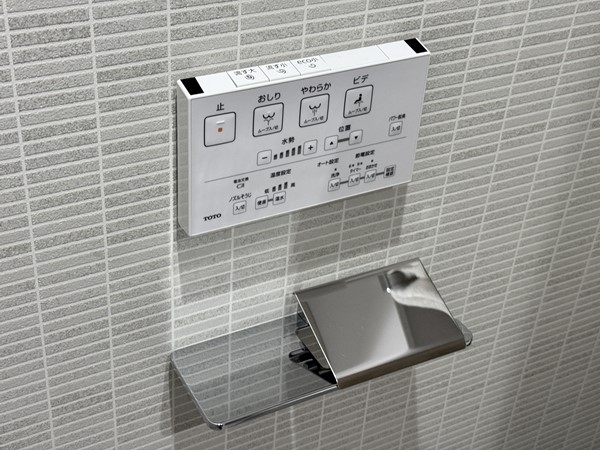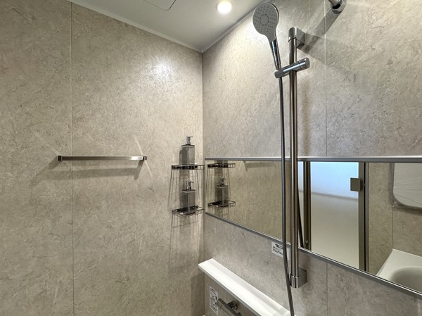 横に長い鏡のおかげで空間に奥行きの生まれたバスルーム。壁面には大理石調のパネルを採用し、ホテルのような特別感ある空間に仕上がっています。バスタブは幅にも余裕を持たせ、ひとりゆっくりと1日の終わりを感じる優雅な時間に。