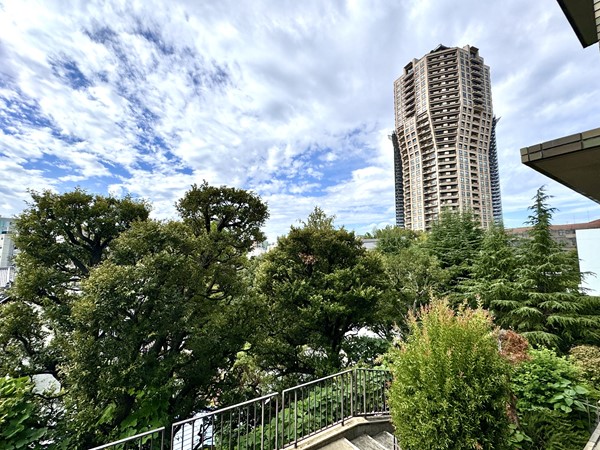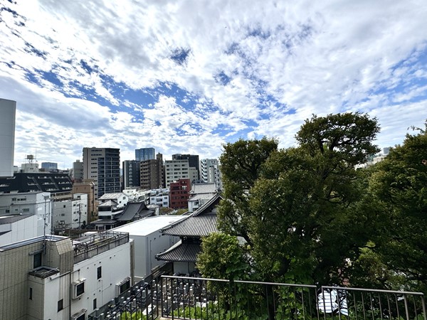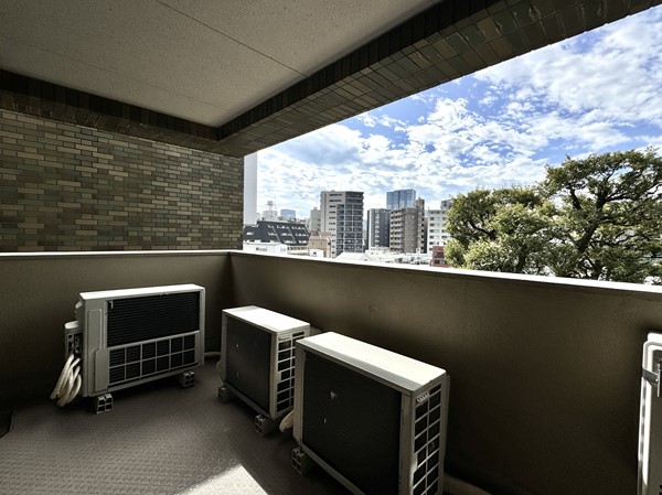 メインルームに面して設けられたバルコニー。大きな建物が林立する都会的な街並みですが、開けた空とグリーンを望める清々しい景色をお楽しみいただけます。奥行きがしっかり設けられているので、ベンチやアウトドアチェアを置いて休憩スペースを設けたり、植物を育てたりすることもできそうです。