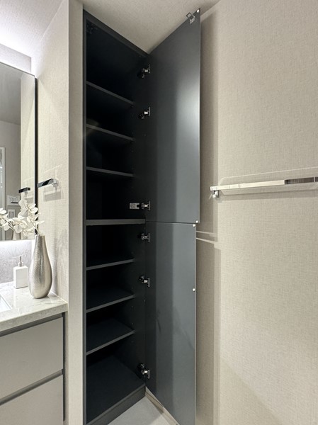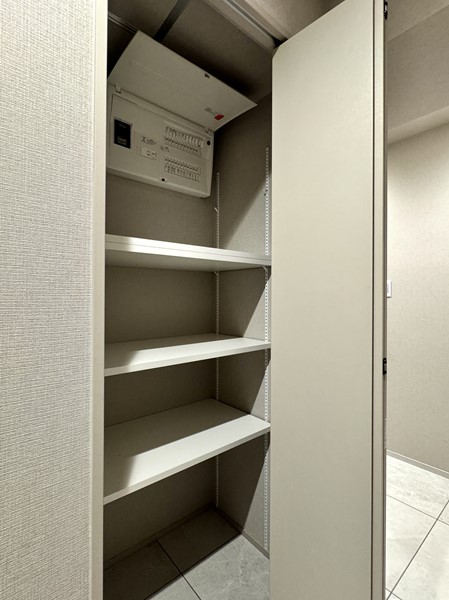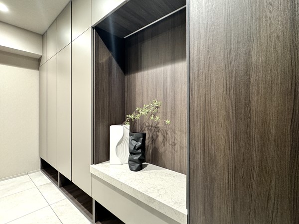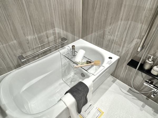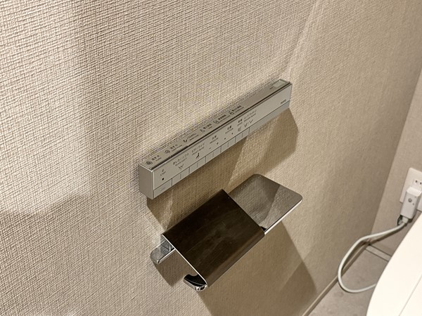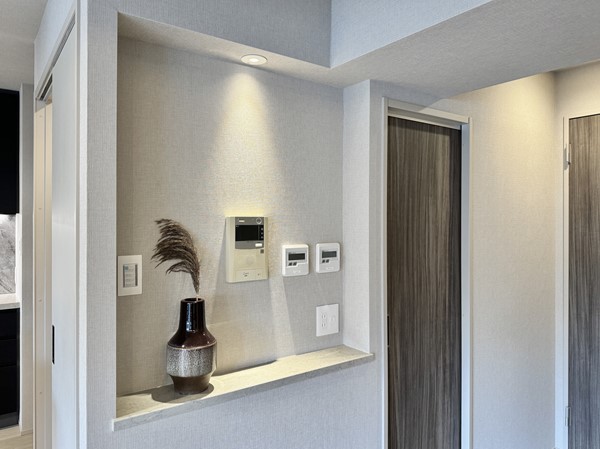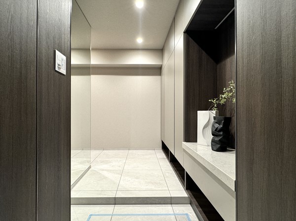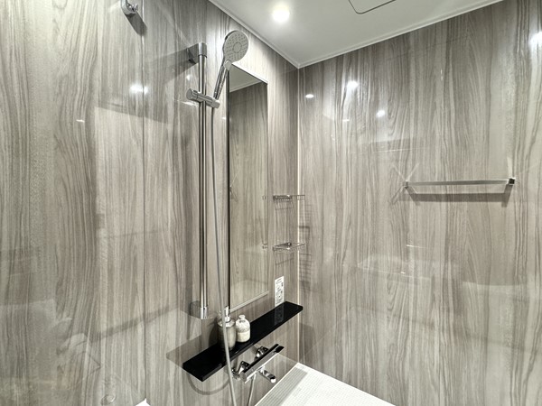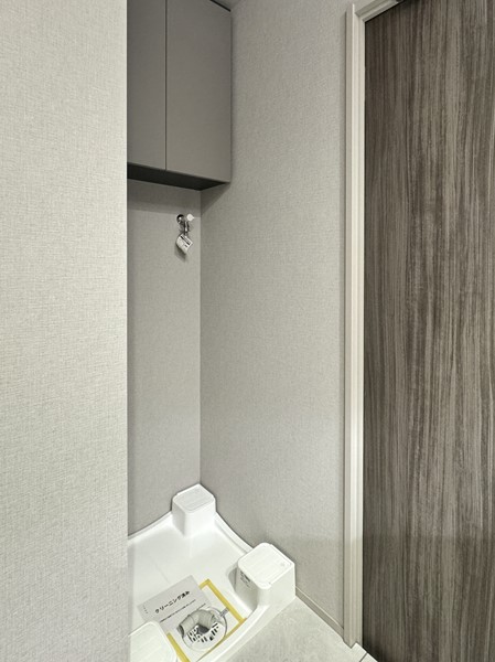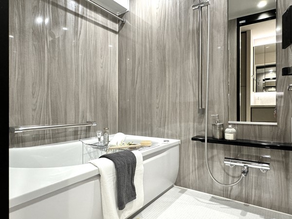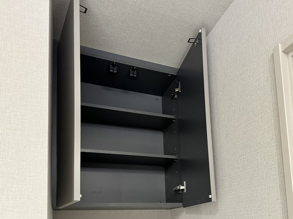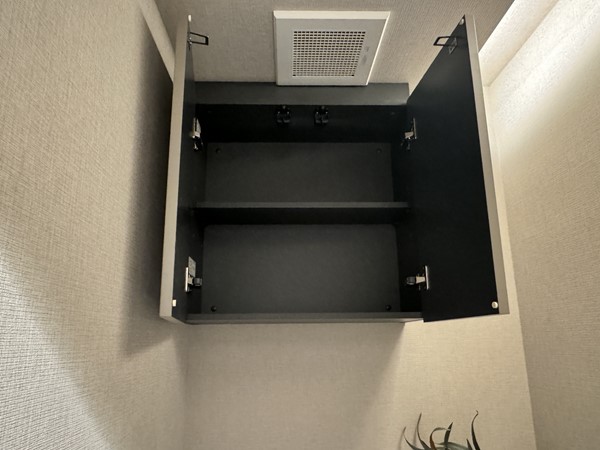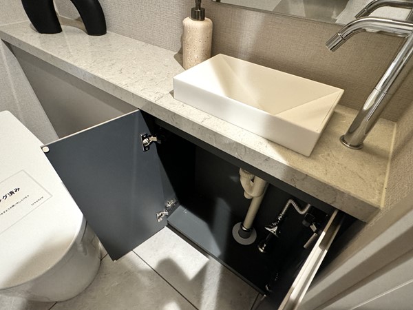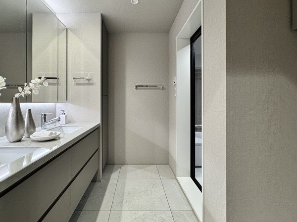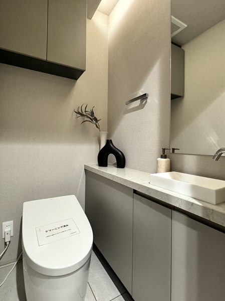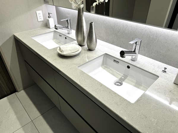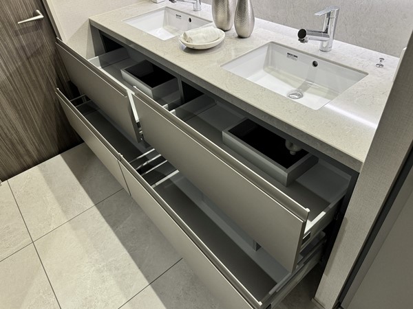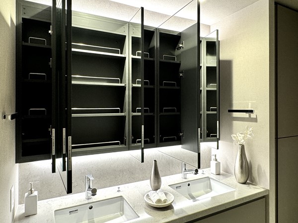 パウダールームは淡いグレーが基調となったスタイリッシュで清潔感のある空間に。洗面化粧台に横幅が広いミラーキャビネットが取り入れられているおかげで、閉塞感が緩和され実寸よりも広々としたスペースに感じられました。収納が豊富に完備されているのも嬉しいですよね。