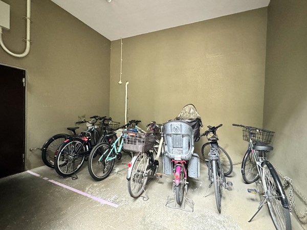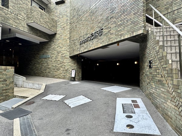 エントランスの右側にはターンテーブル式の駐車場がありました。愛車を雨風に晒すことなく保管することが出来そうです。駐輪場はエントランスの左側に設けられています。