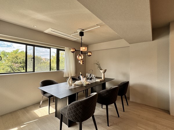 メインルームは角部屋の利点が活かされた二面採光になっており、とても明るく爽やかな印象の空間でした。キッチンの隣にはコーナーウィンドウが取り入れられ、開放感抜群。ダイニングやリビングとしてご利用いただくのも良し、ワークスペースにしたり、植栽を育てるのも良し◎可能性無限大のスペースです。
