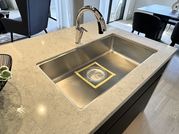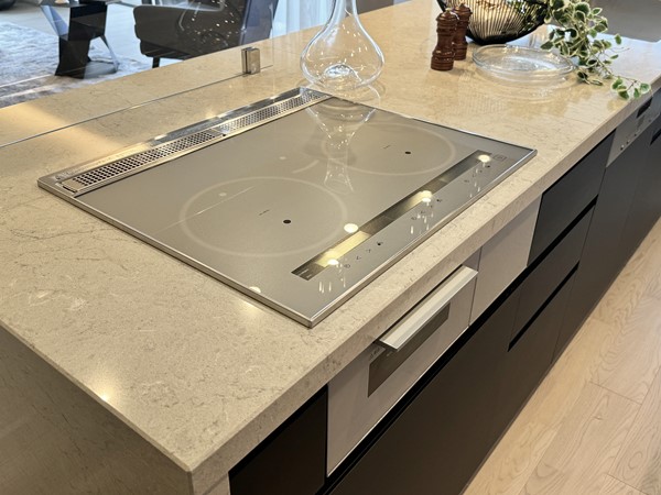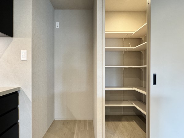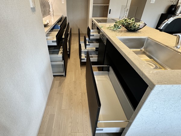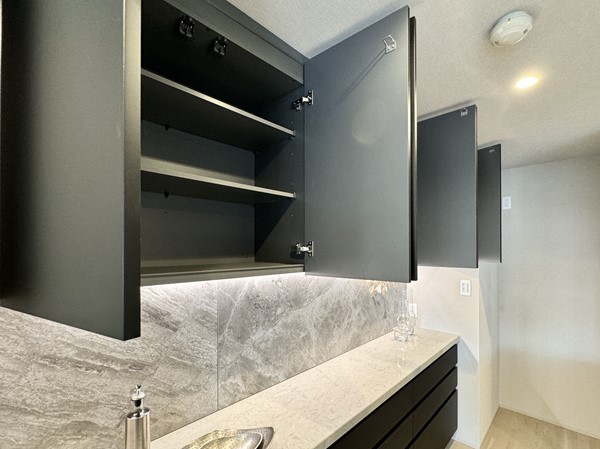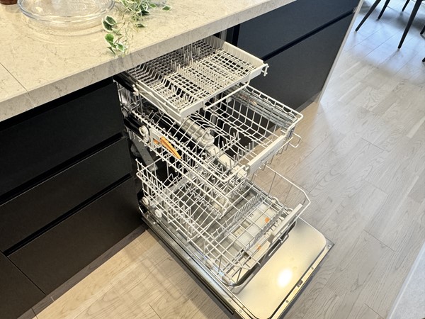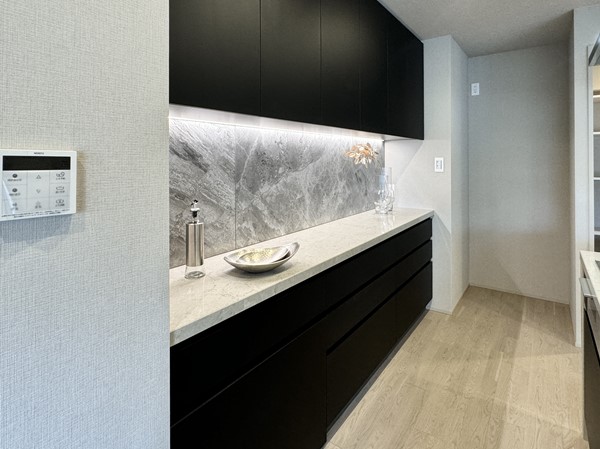 立派なアイランドキッチンも魅力的なポイント。ブラックのキャビネットにストーン調のワークトップが取り入れられ、上品で洗練された印象です。大きな自動食洗機が内蔵されているので、家族全員分の食器を洗うのも楽々♪収納力抜群のカップボードとパントリーも完備され、調理器具やストック類を仕舞う場所には困りません。