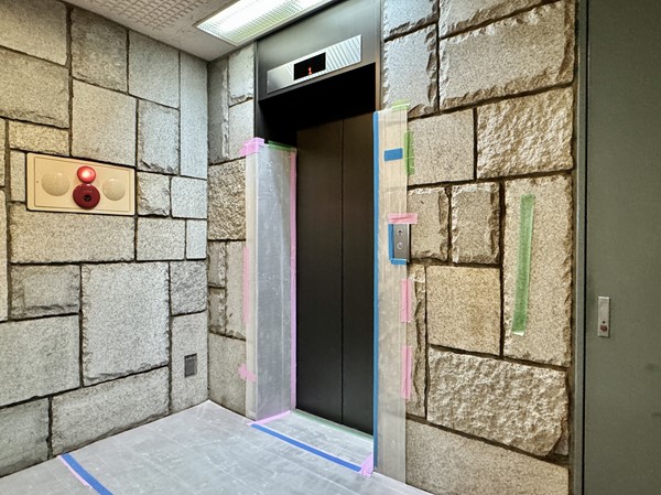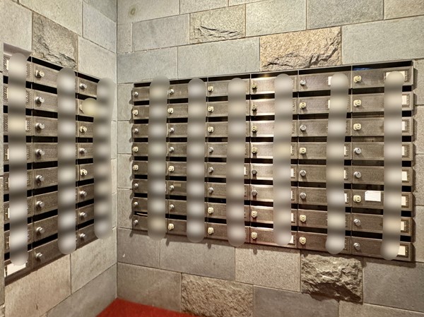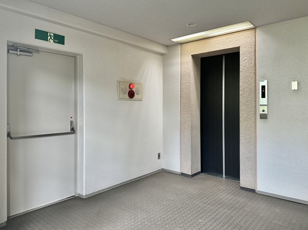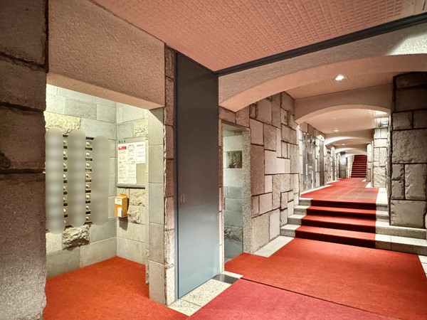 エントランスはストーン調のタイルに包まれた高級感漂う空間です。赤いカーペットが敷かれたステップを上り左に進むとメールコーナーとゴミ捨て場、右に進むとエレベーターが設けられています。
