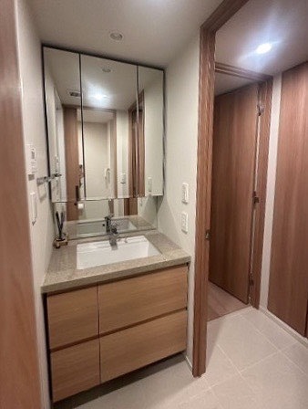 サニタリールームには、3面鏡タイプのミラーキャビネット付き洗面化粧台を採用。歯ブラシや小物類をすっきりしまえる収納力に加え、見えにくい後ろ姿まで簡単にチェックできるため毎日の身支度が快適に行えます。洗面台下の大容量引き出しも使い勝手が良く、ドライヤーやシャンプー類のストックなどをまとめて収納できるため、洗面周りが散らかりにくい点も魅力です。