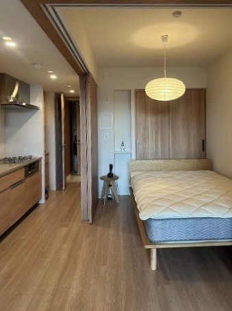 キッチン横には約4.5帖の洋室が。2面に設けられたスライドドアを開ければ、キッチンやメインルームとひと続きになる開放的な空間に早変わりします。来客の際にはドアを閉めるだけでプライベートスペースとして独立させることができるため、オンとオフの切り替えもしやすいのが嬉しいところ。もちろんクローゼットも完備しているので、衣類や荷物の収納にも困りません。