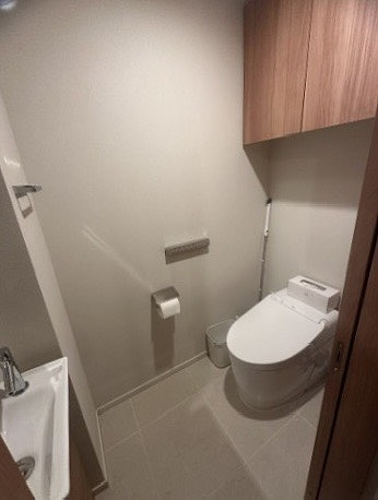 トイレはシンプルで清潔感のあるデザインでまとめられており、温水洗浄便座を採用した快適な仕様。手洗いカウンターが設けられているのも嬉しいポイントです。背面には収納スペースも確保されているため、トイレットペーパーや掃除用品のストックをすっきりとしまえ、使い勝手の良い空間となっています。