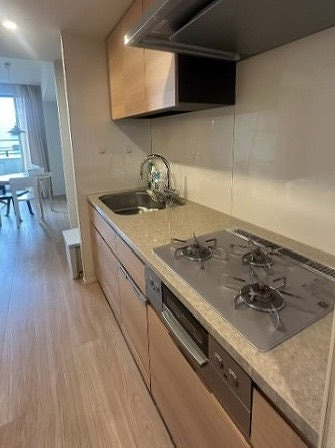 設備面ではグリル付きの3口コンロと広々としたワークトップを備えており、同時調理や作り置きなどもスムーズにこなせます。コンロはお手入れしやすいビルトインタイプを採用しているため、毎日の掃除も負担になりません◎上下に設けられた豊富な収納スペースには調味料・インスタント食品・調理器具などもしっかりと収まり、キッチン周りをすっきりと保てます。
