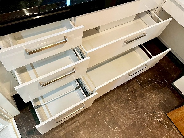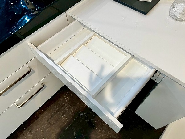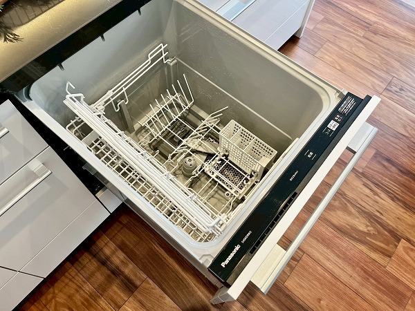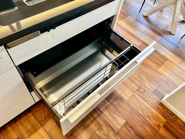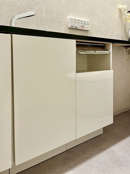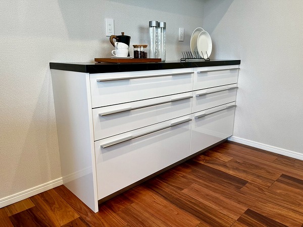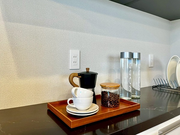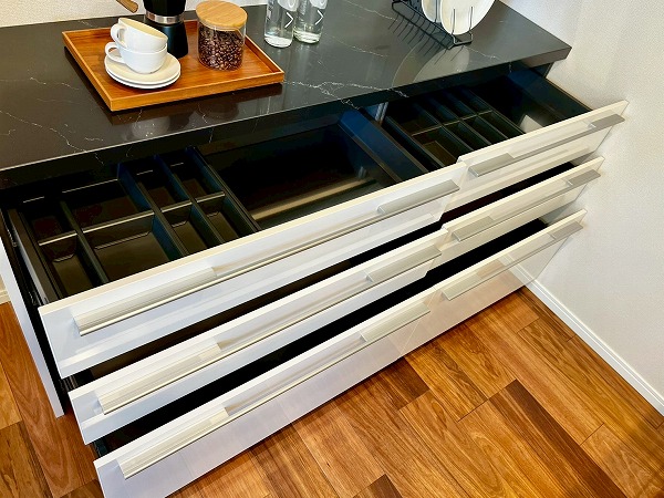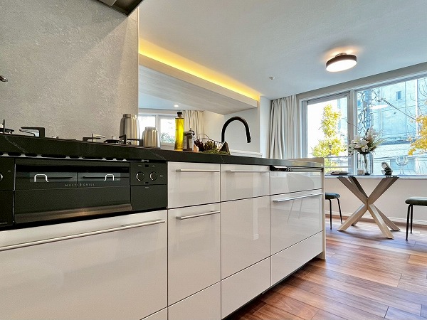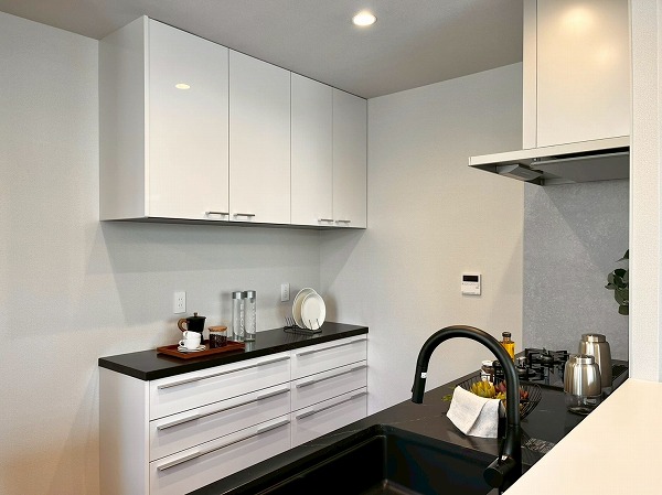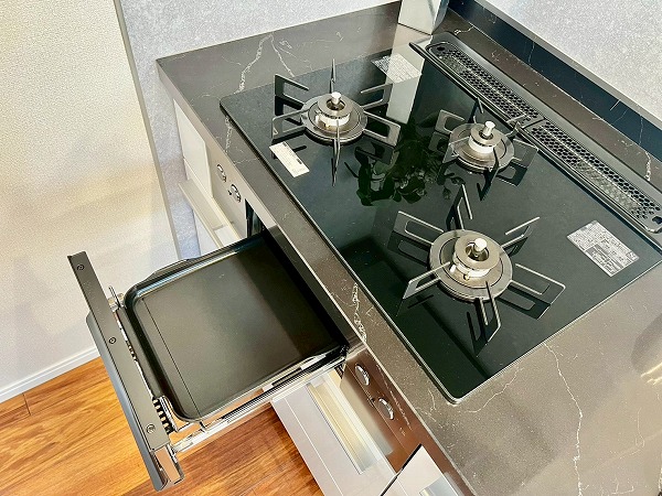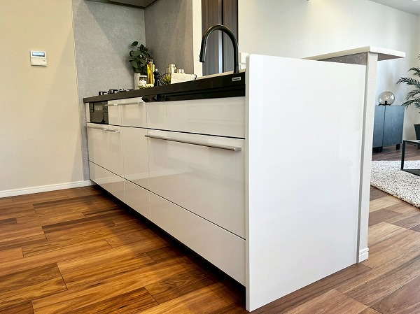海外カフェを思わせるお洒落な3口コンロ付きのシステムキッチン。対面式なので、お料理中もご家族やゲストとの会話が弾みます。背面のカップボードには食器をしまっておける大容量の収納付き。調理家電を並べれば、バリエーション豊かなお料理を楽しめそうですね。