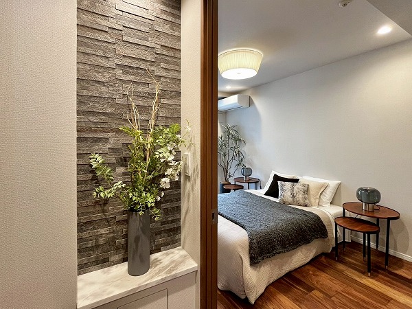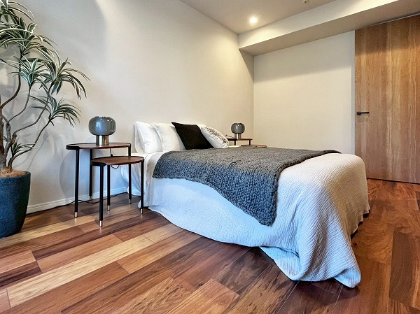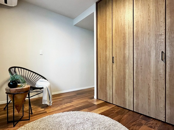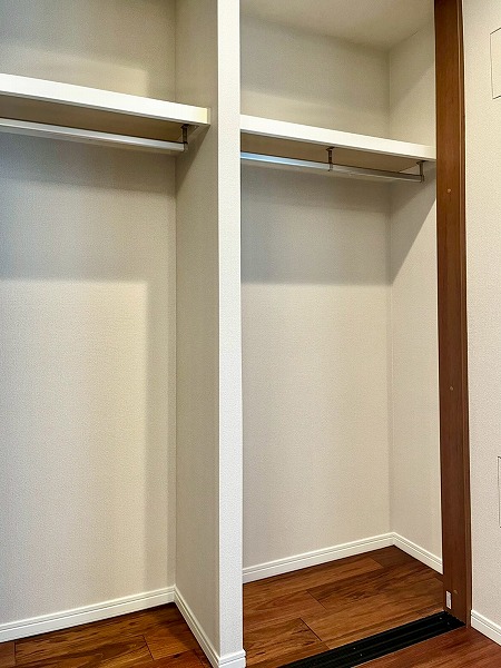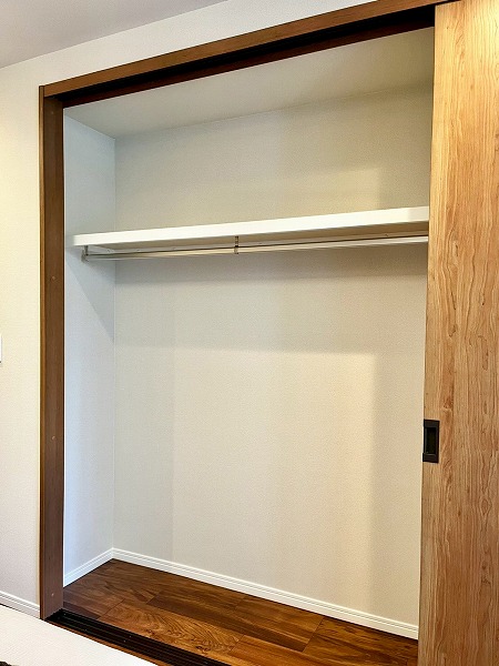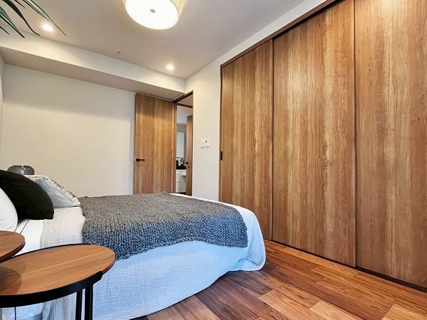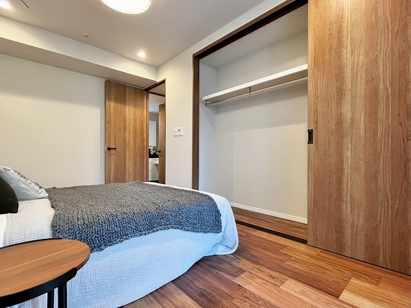 7.6帖の洋室は大きいサイズのベッドを置いても圧迫感がない造り。クローゼットの内部には仕切りが設けられ、普段使いのお洋服と晴れの日のお洋服を整理してしまっておくことができます。南東向きの窓からはバルコニーへ出ることができ、窓を開けて新鮮な空気を取り込めば、すがすがしい1日の始まりを迎えられますね。