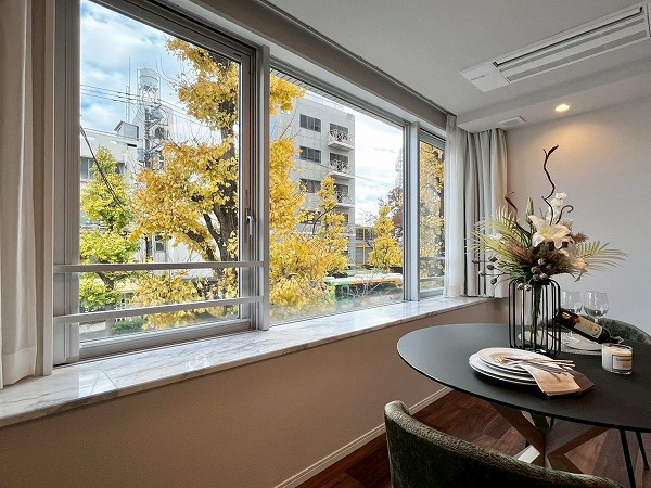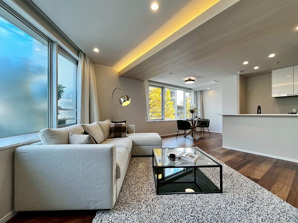 間接照明がお部屋のアクセントとなった上品なメインルームは23.6帖。光の入る大きな窓の向こうには緑が揺れ、都心の中にほっとした安らぎを感じられる贅沢な空間です。ペット可物件なので、愛するペットと一緒に新生活を始められるのも嬉しいですね。