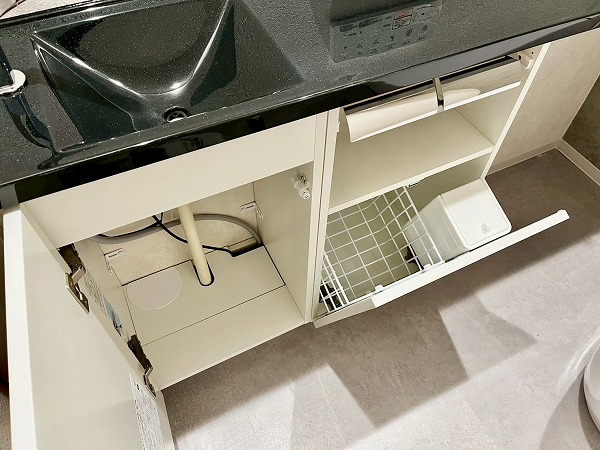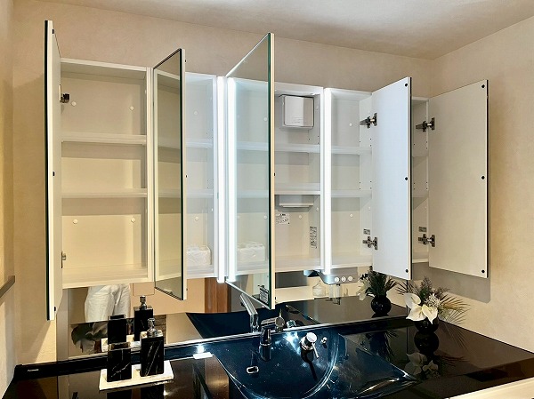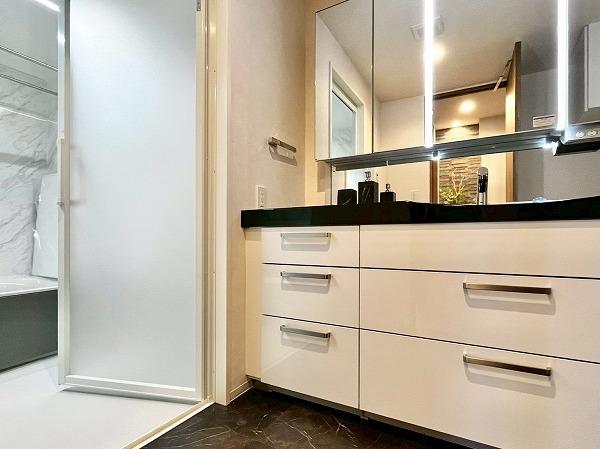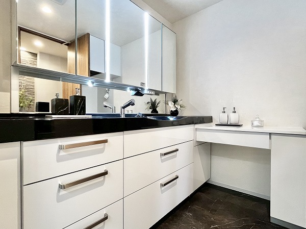 ブラックの洗面ボウルがホテルライクな高級感を醸し出すパウダールーム。ミラーが広く取られ、毎朝の身だしなみの確認も気分が上がりそうです。洗面化粧台の横にはアクセサリーが収納可能なカウンターが付いています。