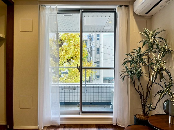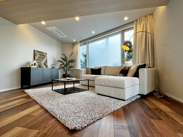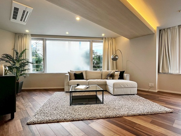 窓の一部には曇りガラスを採用し、開放感とプライバシーの両立を実現。LDKには、ビルトインエアコンが2基設置されており、お部屋全体を快適な温度に保ちます。寒い冬には床暖房を併用すれば、足元から温かくくつろいでいただけますよ。