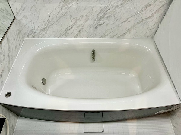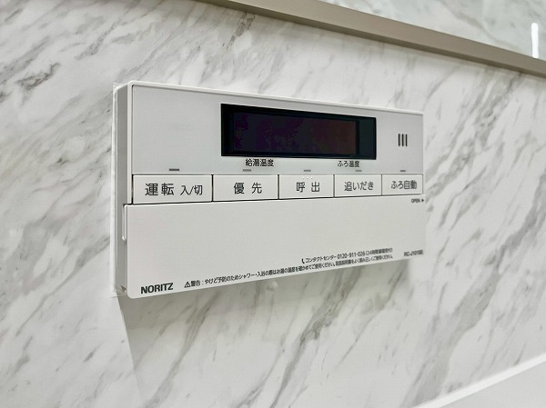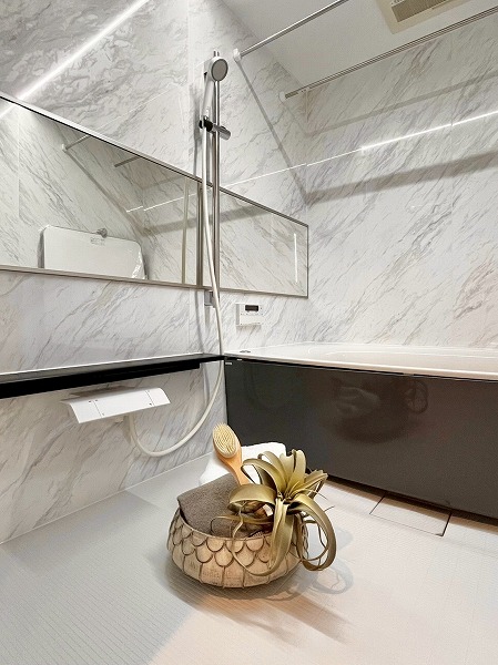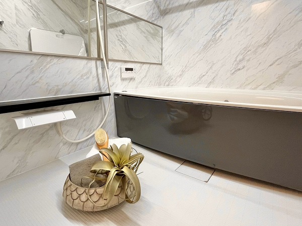 大理石調のパネルが上品なバスルームは、バスチェアを置いても余裕のある広さ。水栓のデザインなど、細部までこだわって作られています。浴室乾燥機能と追い焚き機能がついて、忙しい毎日でも自分のペースにあった毎日が送れますよ。