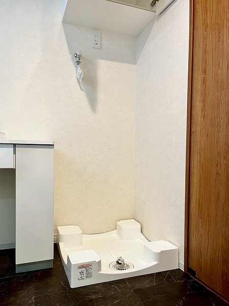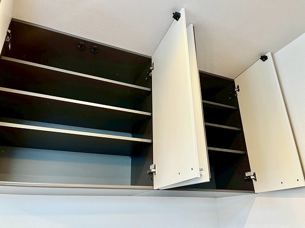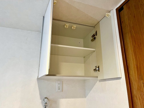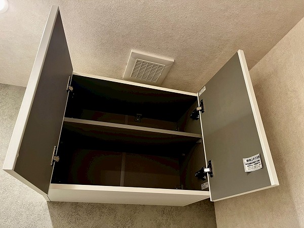 タンクレスのトイレがスタイリッシュな印象。ビルトイン収納も相まって、すっきりとした空間に仕上がっています。個室内に洗面カウンターが設けられ、すぐに手を洗える動線の良さも◎上部にはトイレットペーパーやお掃除グッズを置いておける2段棚が付いています。