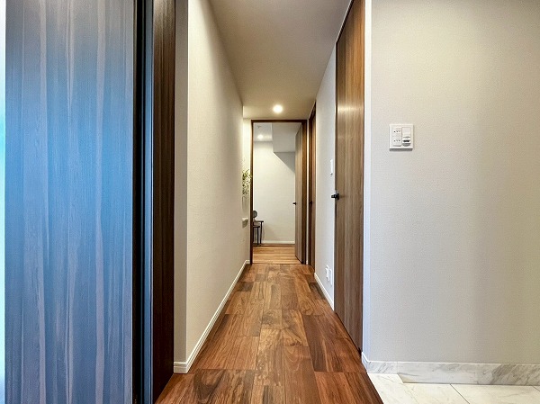 まるでホテルのような内廊下は、扉と扉の間隔が取られ、プライバシー面に配慮が◎足元に敷かれた絨毯が足音を吸収し、早朝や深夜も気を遣わずに済みます。手すりがついて、どんな方でも歩きやすい設計です。