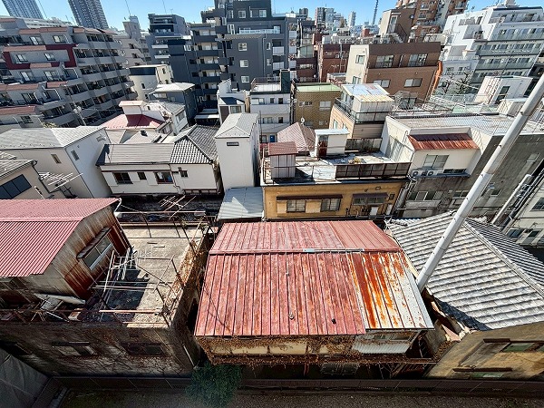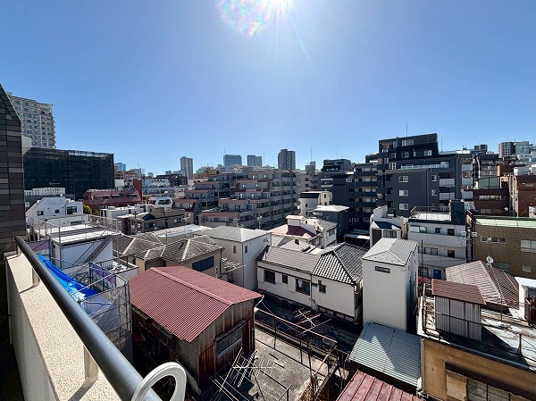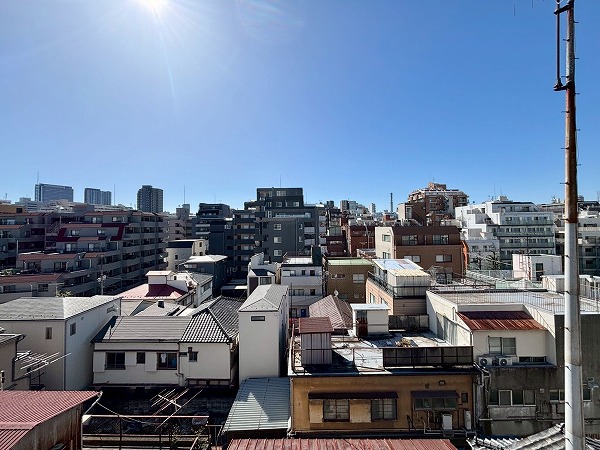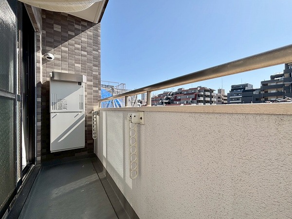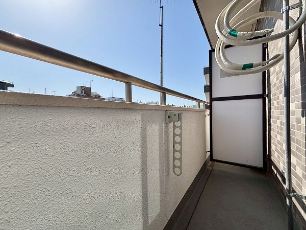 南向きのバルコニーは正確な広さはわかりませんが、幅が広いのでお布団やシーツなどの大きなお洗濯物も干しやすそう。周囲に高い建物がなく、遠くの方まで見渡すことができます。小学校のあるエントランス側の通りとは反対向きなので、周囲の環境音も気にならず静かでした!