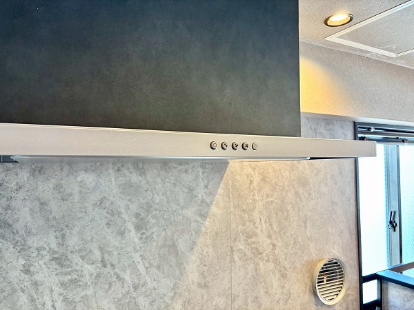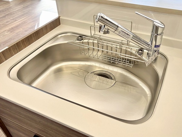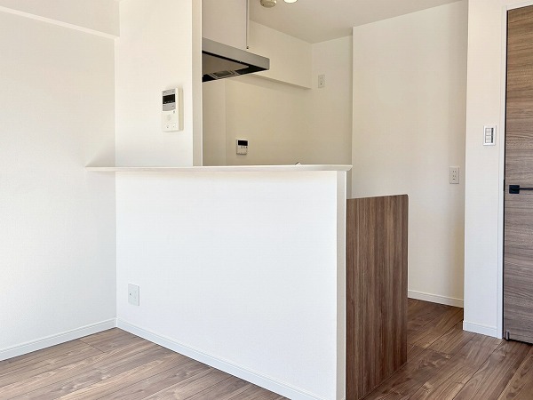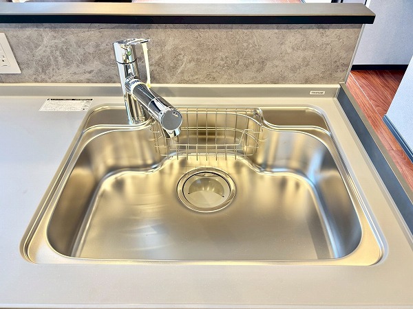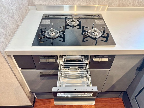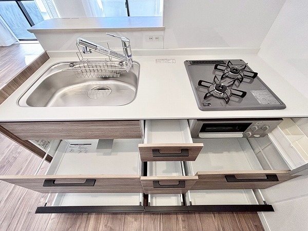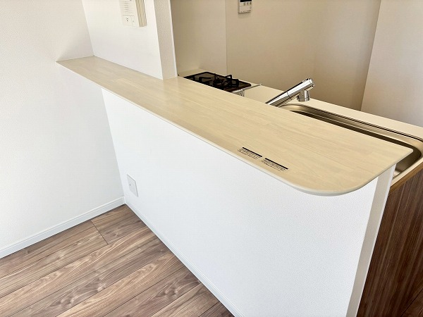 メインルームの雰囲気にマッチした白×木目のデザインが素敵なシステムキッチン。コンロ前に壁があるセミオープンタイプなので、油や汚れが室内に飛び跳ねるのを防いでくれます。シンクが広く、お皿洗いがしやすいですね。2口のガスコンロと魚焼きグリルを使って、同時に何品か調理することが可能。