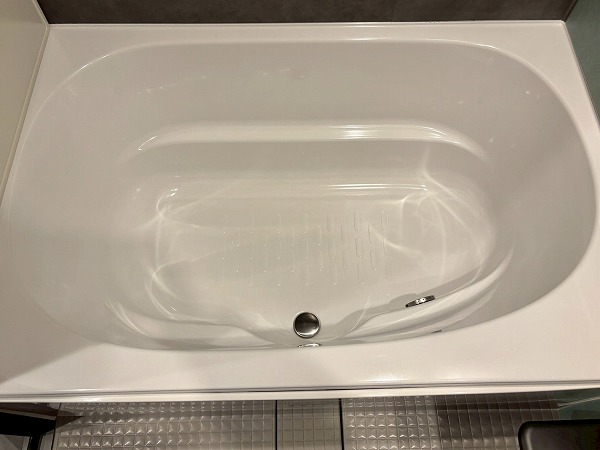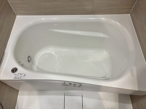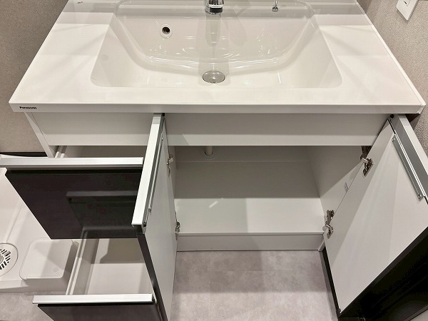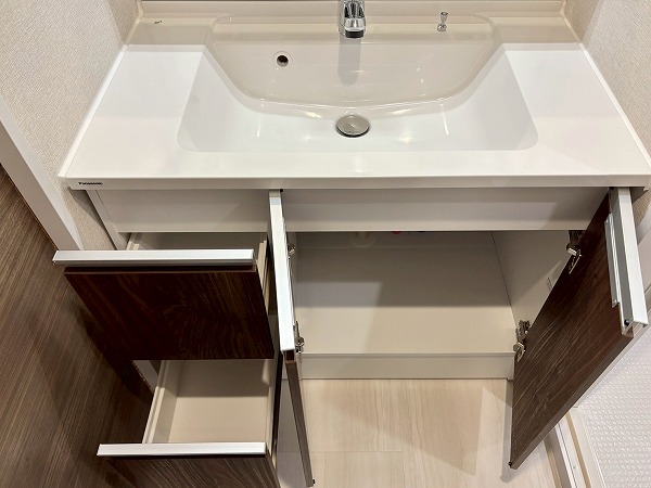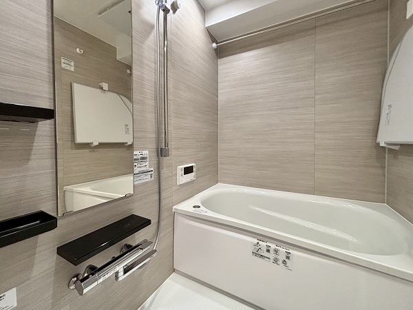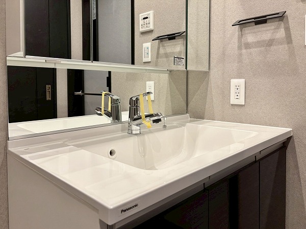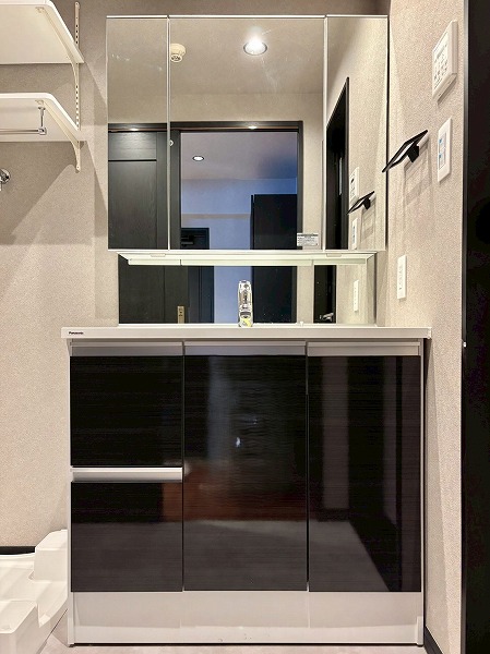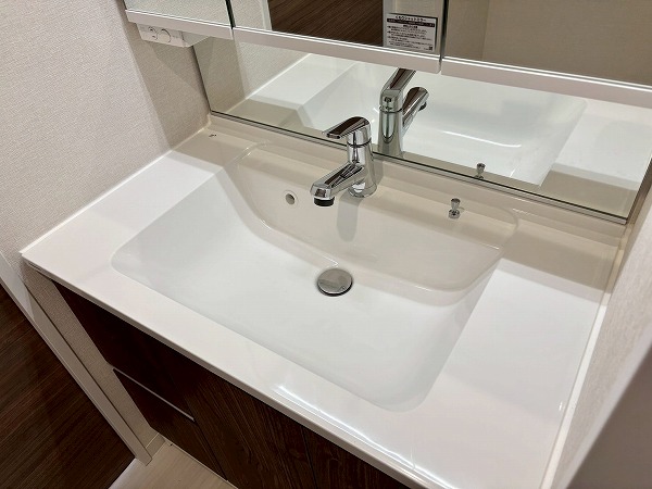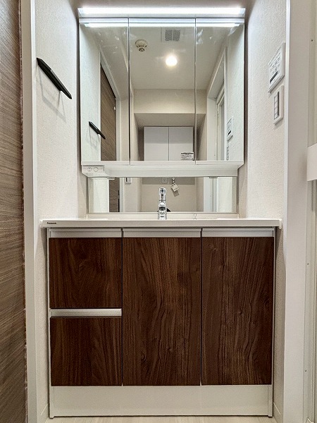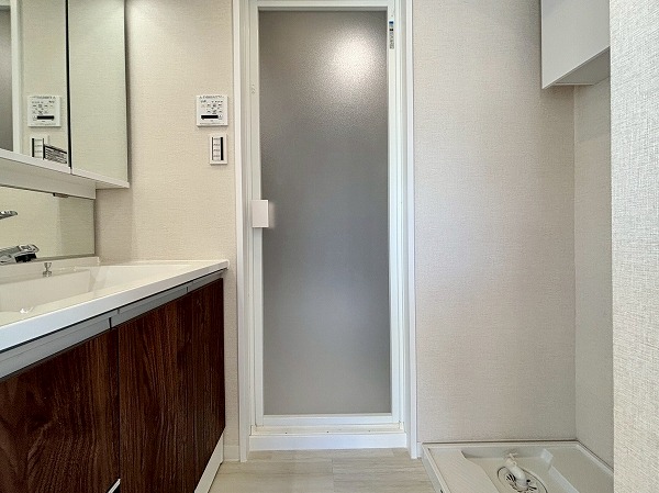 メインルーム同様白×木目を基調としたパウダールームへ。モダンなフロアタイルが高級感を醸し出していますね。3面鏡の洗面化粧台にはミドルミラーが付いていて、屈んだ状態でもお顔を確認できます。ユニットバスも新規交換されており、綺麗なお風呂にご入浴いただけます。