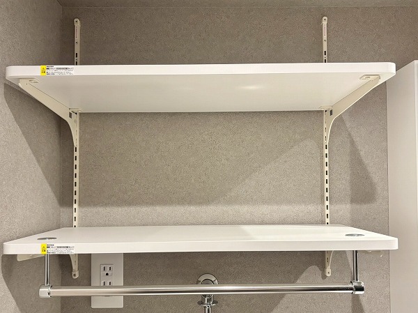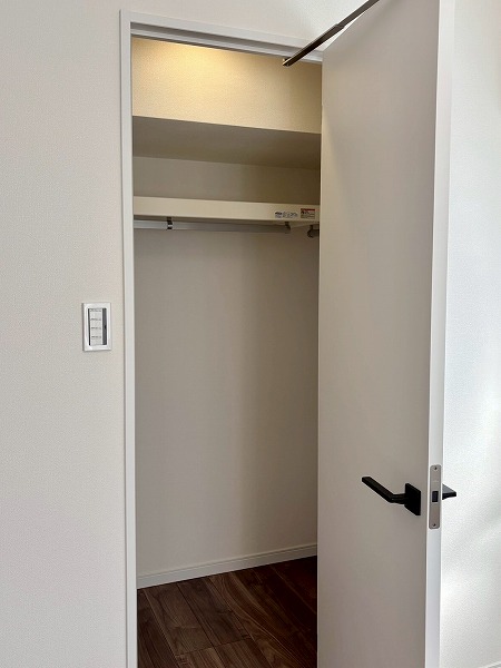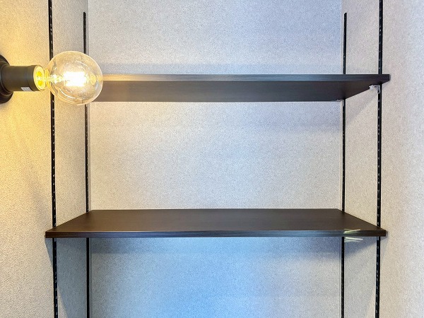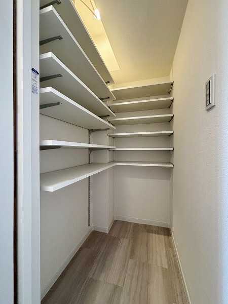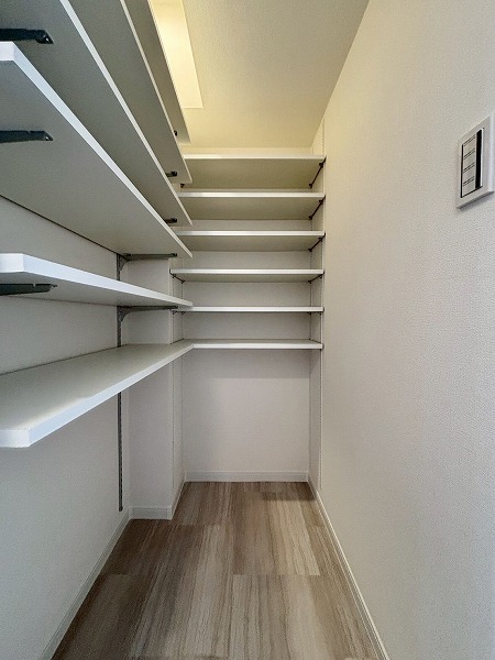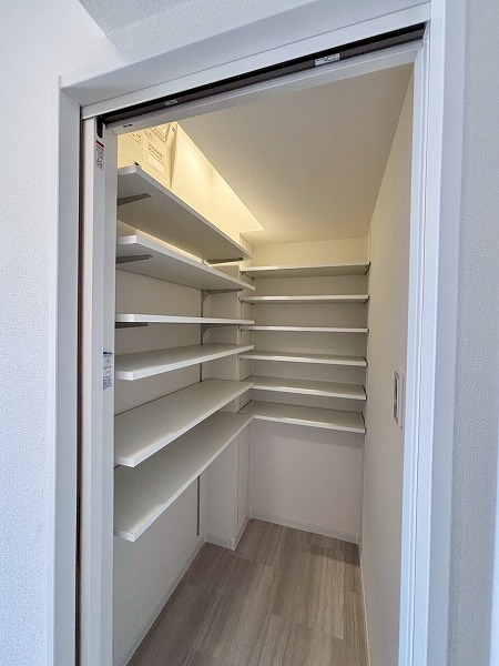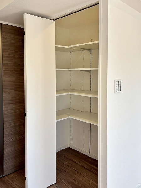キッチンの横には、こちらの大きな収納スペースがあります!2面に可動棚が備わっていて収納力抜群。日用品やお掃除道具の保管場所はもちろん、パントリーとして使うのもオススメです。収納力の高さは、今回の1LDKの魅力の1つなんですよ。
