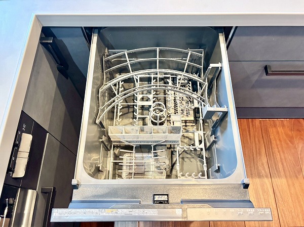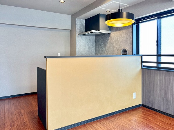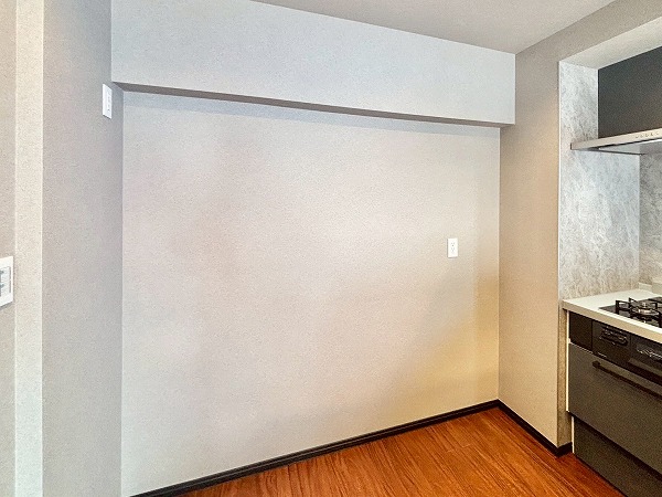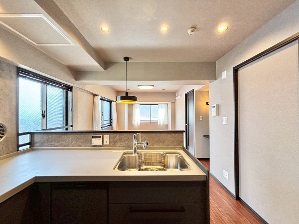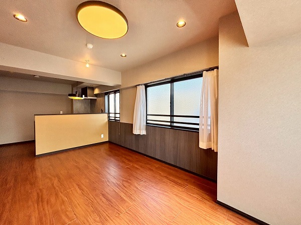 リビングダイニングキッチンは約14.3帖とゆとりがあります。角部屋ならではの2面採光になっていて、お部屋がより広く感じましたよ。深みのあるフローリングが美しいですね。クロスや建具も落ち着いた色合いで統一された、オシャレな空間です。