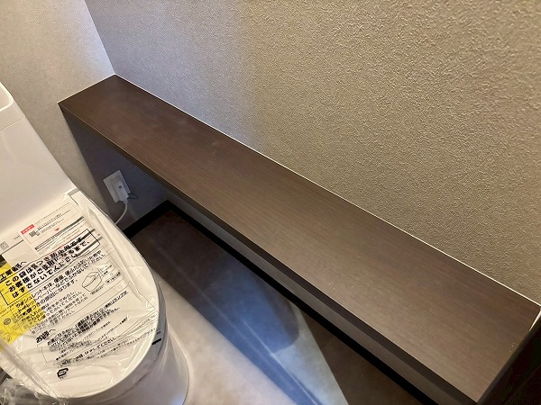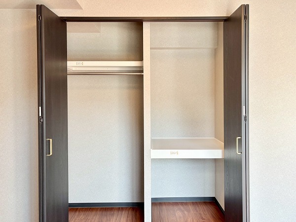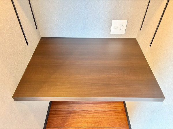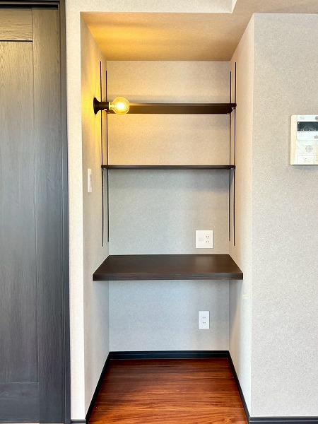 メインルームにはまだまだ注目ポイントが。洋室へのドアの手前にこちらのデスクスペースが備わっています。デスクは幅が広く、デスクトップのパソコンを置いても作業がしやすそう。上部のラックは可動棚になっていて、置くものに高さを合わせることができます◎