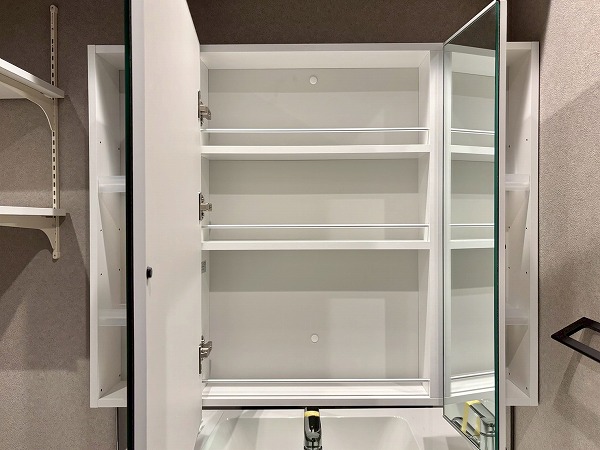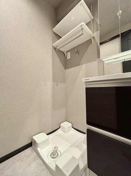 モノトーン調でクールな雰囲気のパウダールーム。洗面化粧台下の収納には光沢感のある扉が使用され、高級感をプラスしています。洗面ボウル周りのカウンターが広く造られているので、タオルやブラシなどが置きやすくスムーズに作業ができますよ。洗濯機置き場の上部に可動棚があるのも嬉しいですね。