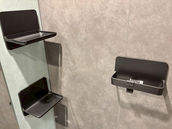 グレーと爽やかなライトブルーのパネルが使用されたバスルーム。縦型のミラーが開放感をもたらしています。バスルームの壁にはマグネットが付くようになっていて、マグネットで付くラックが3つも用意されていました。フックなども使用して、より使い勝手の良い空間にカスタマイズしてくださいね。