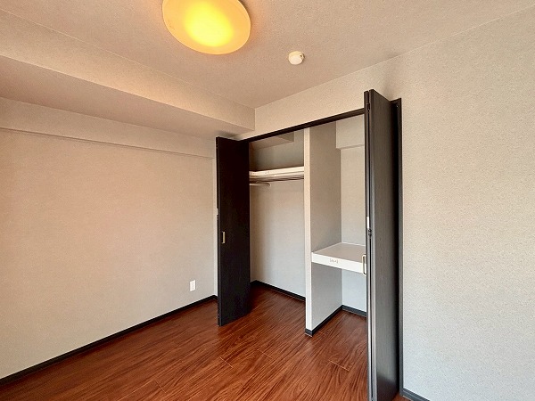 およそ5.0帖の洋室は、南向きで日当たり良好。冬場でも室内は暖かく快適に暮らせそう。大きなクローゼットが備わっているので、お洋服はたくさんしまえますね!レールが上部のみに設けられた上吊り戸なので、お掃除がしやすい上に空間がスッキリ見えますよ。