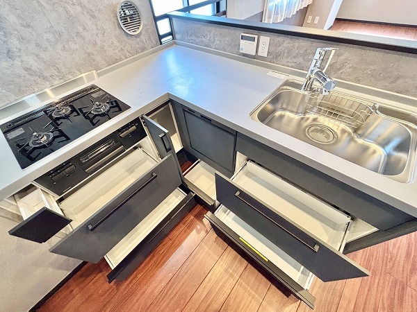 作業スペースが広く収納が豊富と人気なL字型のキッチン。今回の新規リノベーションで新しいものに交換されているので、気持ちよくご利用いただけます♪キッチン背面にスペースがあるので、カップボードや冷蔵庫も設置可能。