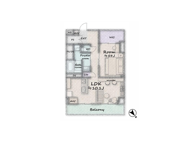 3階に位置する1LDKのお部屋は、ペールグリーンのアクセントクロスがテーマカラーに用いられた爽やかでかわいらしいお部屋です。メインルームはカフェ風のシーリングライトと小窓がアクセント。カウンターが設けられ、こちらでお食事を摂ってもよし、パソコン作業の際に使ってもよしの万能スペースです◎