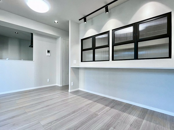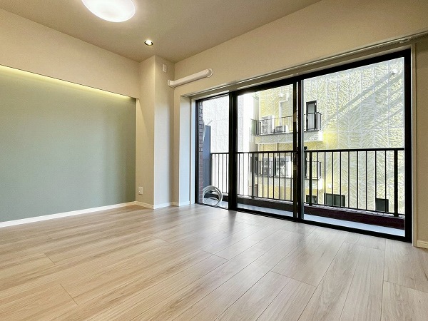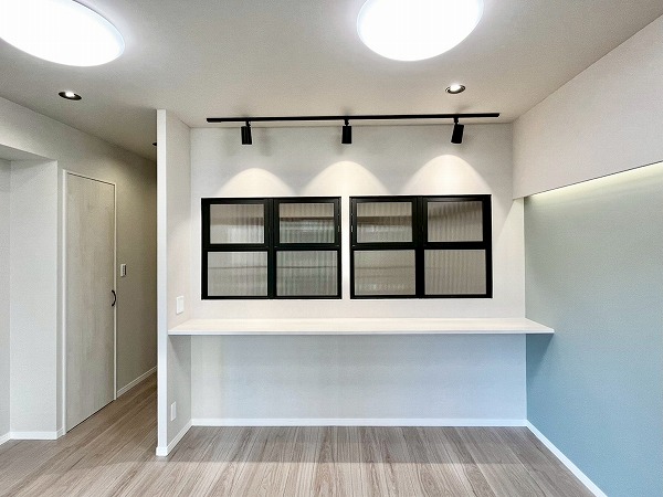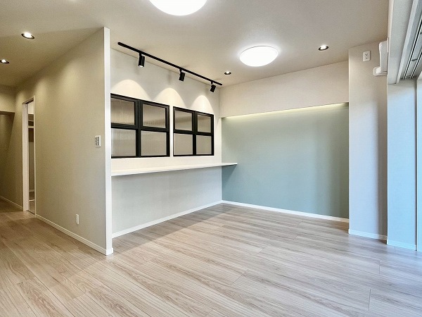 3階に位置する1LDK+WICのお部屋は、ペールグリーンがテーマカラーとして用いられ、センスを感じる雰囲気。そこに建具や照明のブラックカラーが加わって、お部屋をぐっと引き締め、目を楽しませてくれます。あらかじめカフェカウンターが設けられているおかげで、専用のデスクなどが場所を取る心配はなさそうですね。