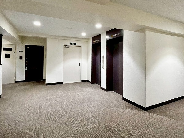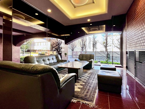 照明や絨毯にレトロな魅力を感じるエントランススペースには、タクシーのお待ち合わせなどに便利なソファセットがありました。セキュリティのしっかりしたオートロックを抜けて、お部屋へと向かいます。