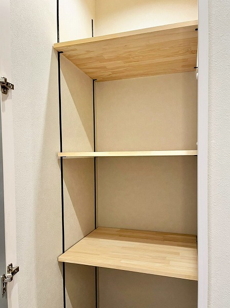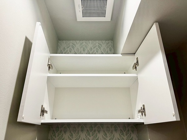 リーフ柄のアクセントクロスが用いられ、爽やかな印象のトイレ。玄関、洋室、メインルームのどの位置からもアクセスしやすく、使い勝手が◎フレグランスやペーパーのストック、お掃除グッズなどは上部の棚にすっきりとしまっておけそうです。