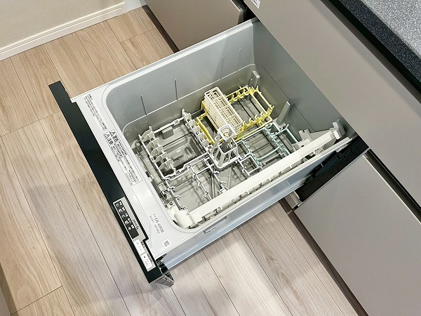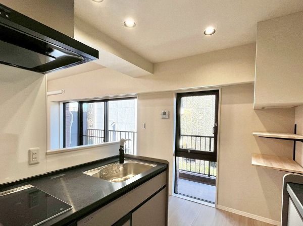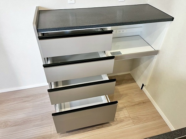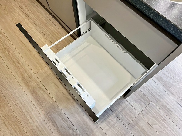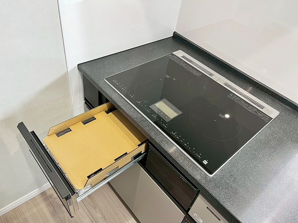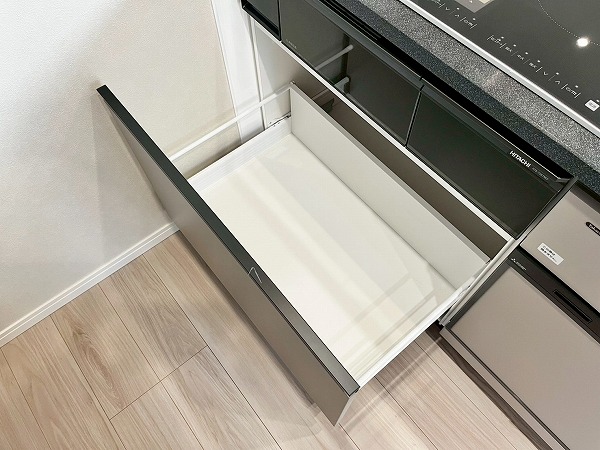 クールな魅力にあふれたキッチンはグリル付の3口IHを搭載。すっきりとしたワークトップはお掃除がしやすく、毎日清潔な調理環境をキープ✧キッチン脇にはお米や買い置きの食料品を保管しておけるシェルフがあり、大変重宝しそうです。
