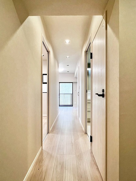 ホワイト基調の落ち着いた内廊下。温度が一定に保たれ、1年を通して移動がしやすいです。エレベーターは2基設置されているため、朝の時間帯に待ち時間に悩まされる心配はぐっと減りそうですね。