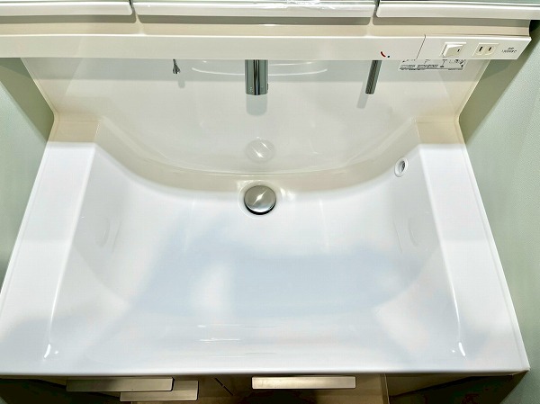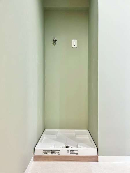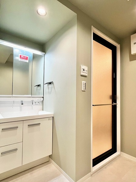 パウダールームもお部屋とお揃いのグリーンで統一され、まるで洋画にでも出てきそうなセンスの良い空間に仕上がっています。毎日使っても飽きの来ない穏やかさが感じられました。洗濯機がパウダールーム内にあり、入浴→洗濯の家事動線がスムーズに行えて効率的。