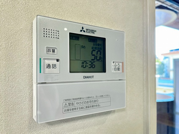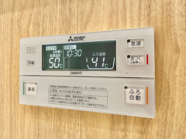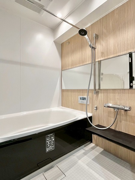 床面にさらりと水はけのよい素材を採用したバスルームは、木目調のパネルとブラックのコントラストが大人の落ち着いたリラックス空間を演出。追い焚き機能を使って、お好きな温度の湯舟を毎日お楽しみいただけます。雨が続く季節には浴室乾燥機を使って、お洗濯物問題も解決です✧
