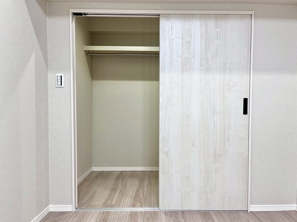 洋室はベッドを置いて、寝室としてお使いいただける十分な広さ。メインルーム内の小窓の先にこちらのお部屋が繋がっており、採光や換気の際に開け閉めすることが可能です。収納が広めなのがポイントで、オフシーズンのお洋服もまとめてしまっておけそうな頼りがいのあるクローゼットです。