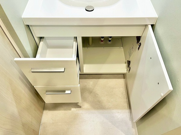 ミラーの裏にシューズラックが設けられ、浮遊タイプのおかげでお掃除のしやすさがUP✧お1人分のシューズならまず入りそうな容量ですが。背の高いブーツやその他アウトドア用品の置き場に困る方は、別に廊下に設けられたストッカーを同時活用するのがいいかもしれませんね。