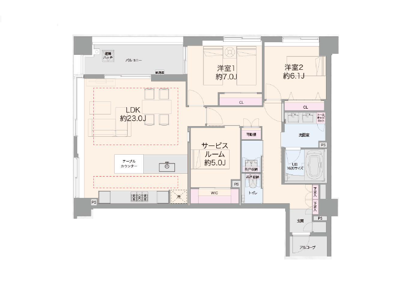 洋室はおよそ7.0帖とおよそ6.1帖の2部屋、さらにおよそ5.0帖のサービスルームがあります。用途に合わせて部屋を使い分けられますよ。サービスルームには窓がありませんが、大きなウォークインクローゼットが設けられているので書斎や仕事部屋としてご利用になってはいかがでしょうか。