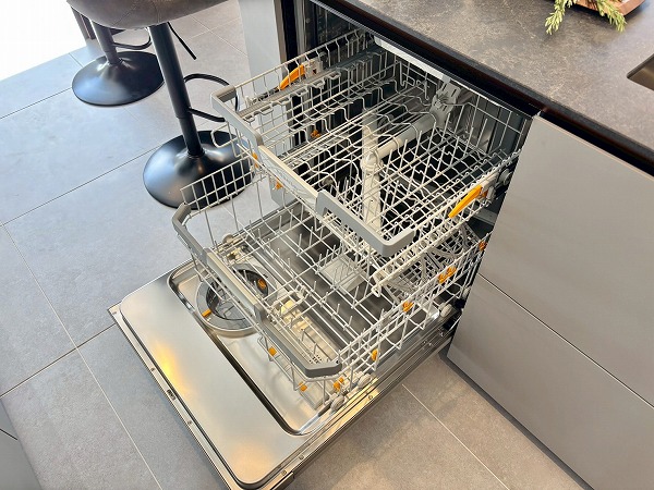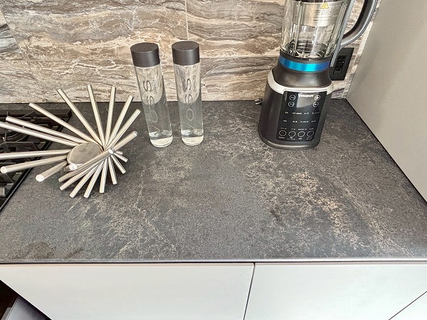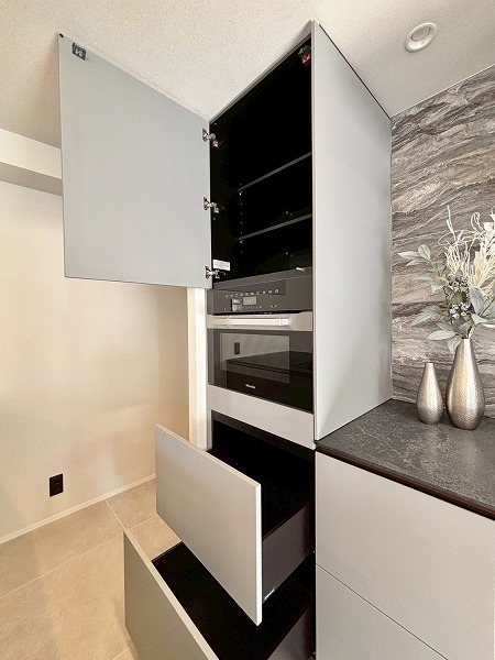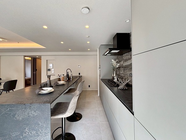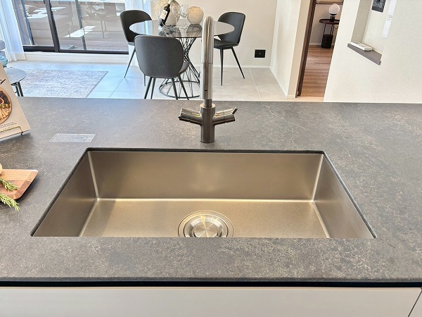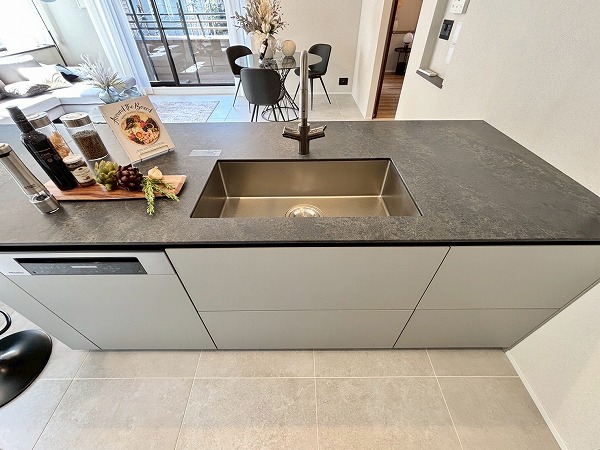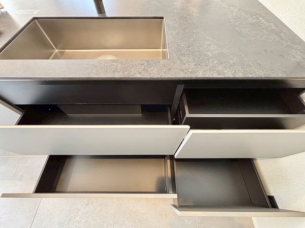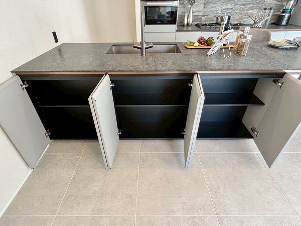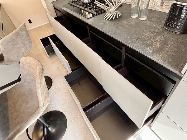 今回のキッチンで私が特に素敵だと思ったのは、このようにシンク横のカウンターをダイニングテーブルとして使用できること。配膳や片付けがスムーズになる上に、家族の生活空間が一体化し絆が深まります。キッチン前面に収納があるので、お皿やカトラリーをしまっておけますよ。