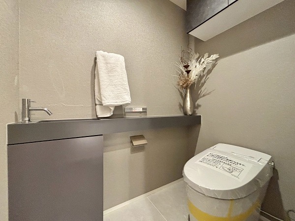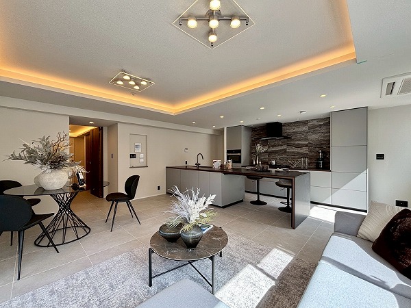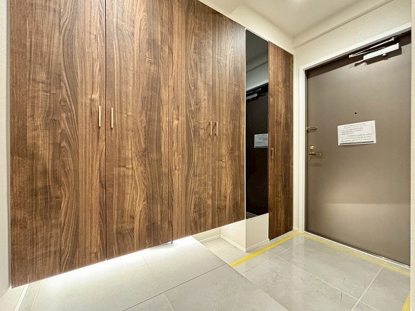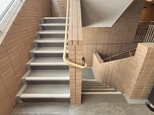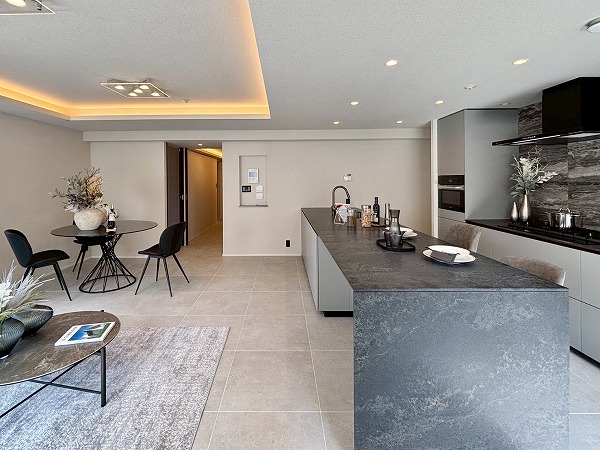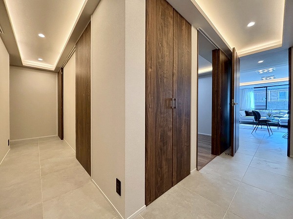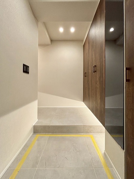 マンション内はタイル張りの高級感あるデザイン。ゆったりとした造りになっていて、居住フロアのプライベート性を高める工夫があちこちになされていました。落ち着いた暮らしを送りたいという方に最適な住まいです。
