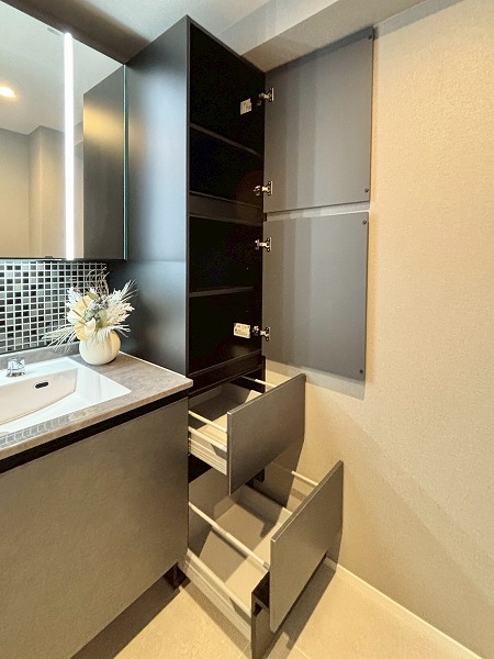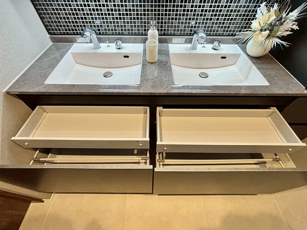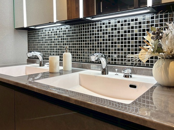 サニタリールームに入ってまず注目したのは、大きなミラーが特徴的なルミシス製の洗面化粧台。壁面のタイルがとってもオシャレですよね。洗面ボウルが2つ並んだツーボウルタイプなので、ご家族と一緒に使用できます。収納の多さも文句なし。