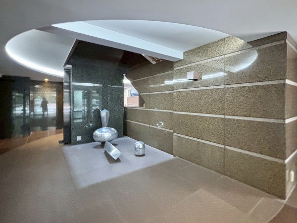 ガラス張りで開放的なエントランスホール。共用部はオブジェが置かれていたり、異なる材質が組み合わされていたりとデザイン性が高く、細かい箇所にまでこだわりを感じました。